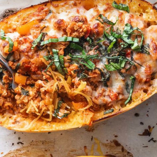 8. Fill with the marinara mixture. Sprinkle a layer of vegan cheese and fresh basil.